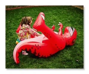 Once the bigger kids were distracted by some birthday-related activity, Cara decided to take on the inflatable dinosaur solo.